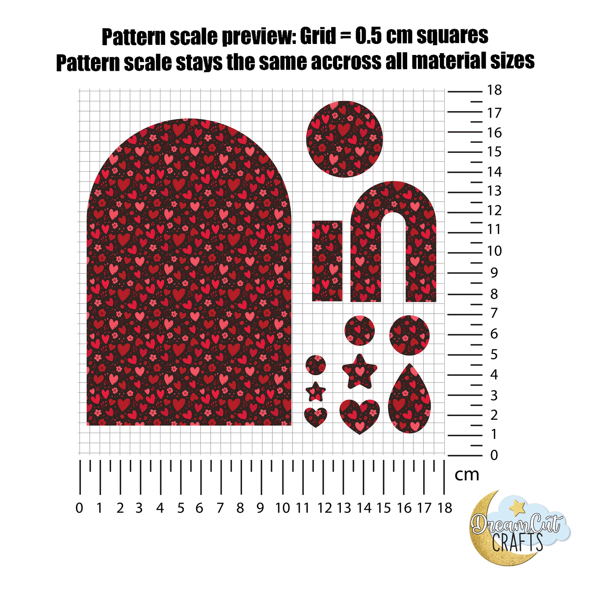 This UV printed acrylic and MDF sheet features a repeating heart and floral pattern set against a dark black background. The design includes hearts in multiple shades of red and pink, combined with small floral and botanical elements that are evenly distributed across the surface. The repeating layout creates a bold love-themed pattern suitable for Valentine’s Day projects and romantic collections.