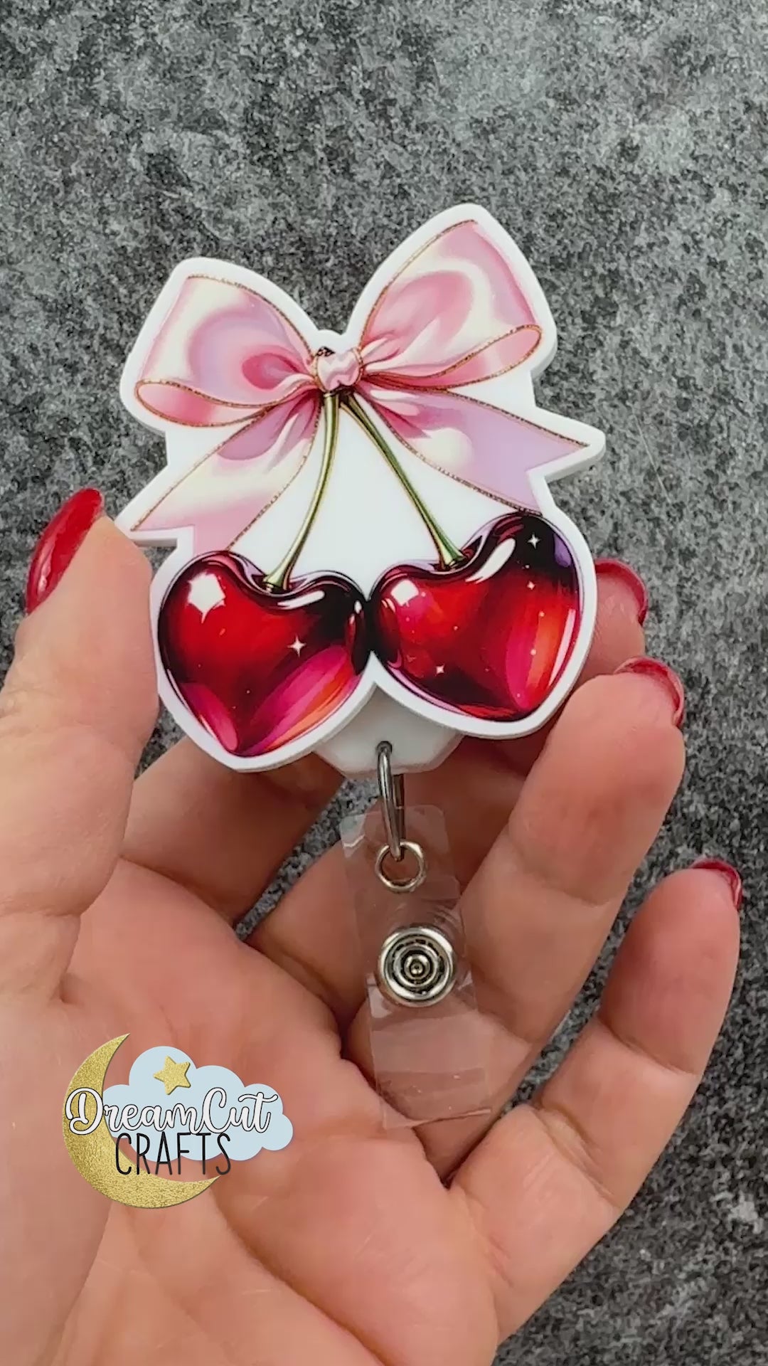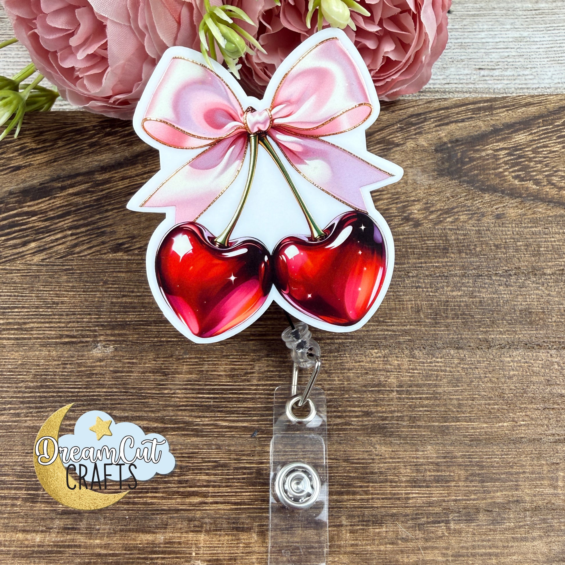 This cherry bow badge reel top features a love-inspired design with glossy red cherries tied together with a soft pink bow. The artwork is UV printed on white acrylic for a clean, high-contrast look that highlights the rich red tones and delicate bow details, making it a perfect fit for Valentine’s Day collections and romantic everyday accessories.