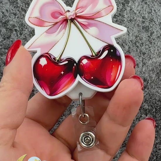Cherry Bow Badge Reel Top UV Printed on White Acrylic 3mm, Love Theme, Cherry Design