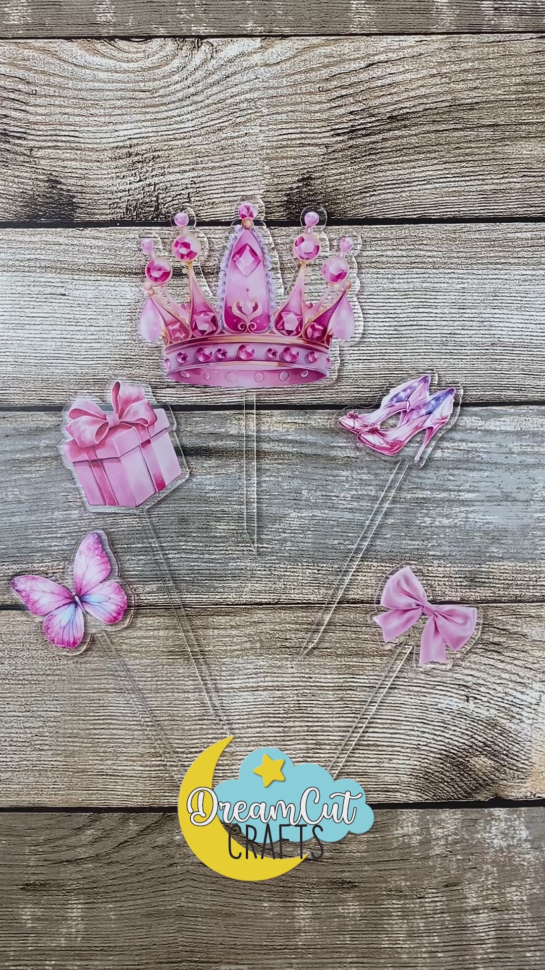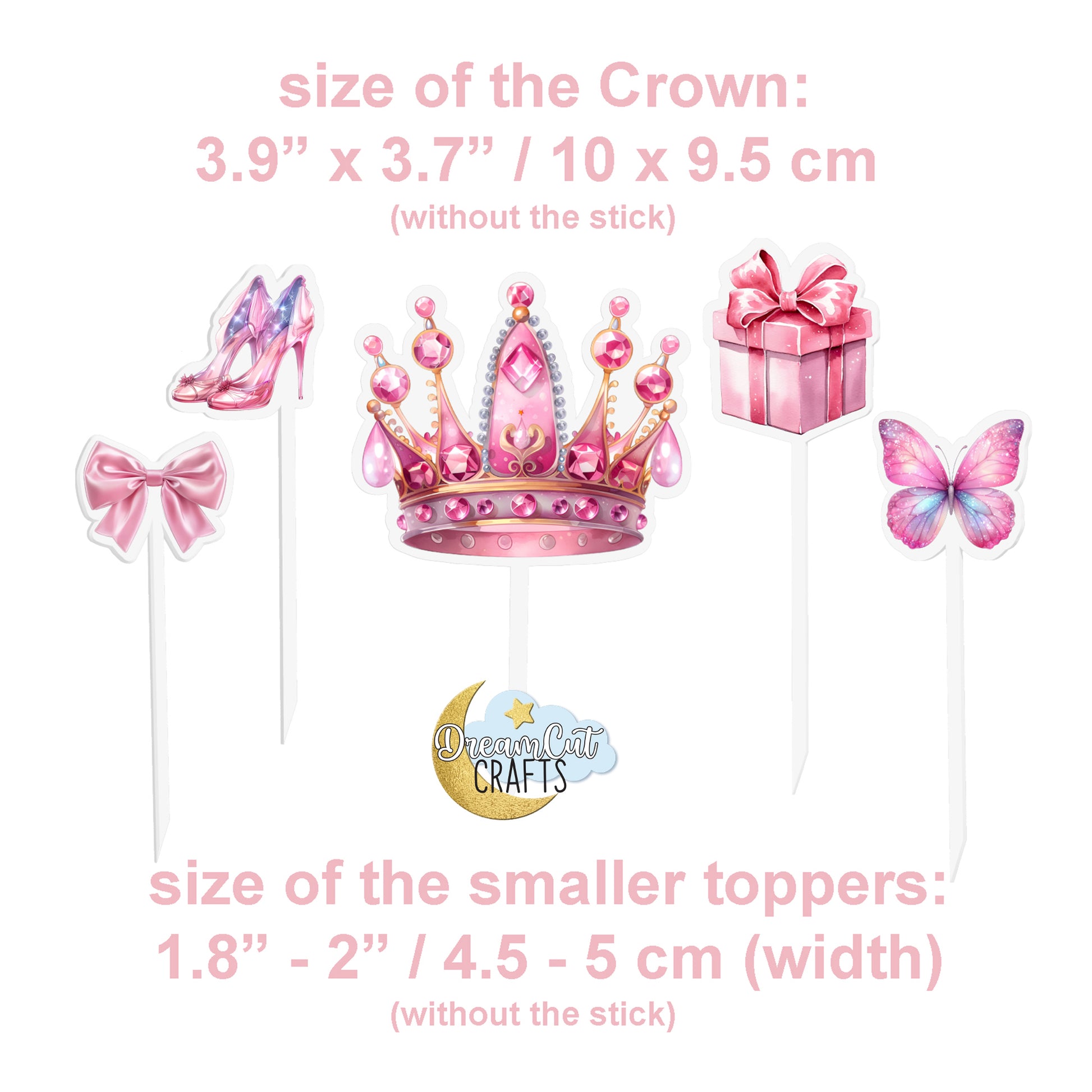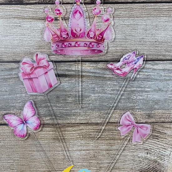Bring fairytale magic to your dessert table with our Princess Cake Topper Set — a charming collection designed to make every celebration unforgettable. This beautiful set includes one large crown topper and four coordinating mini toppers (a bow, butterfly, gift, and glass slippers), all in soft pink tones. Precision laser-cut from durable acrylic with high-quality UV printing, each piece is crafted to deliver vivid color and crisp details.