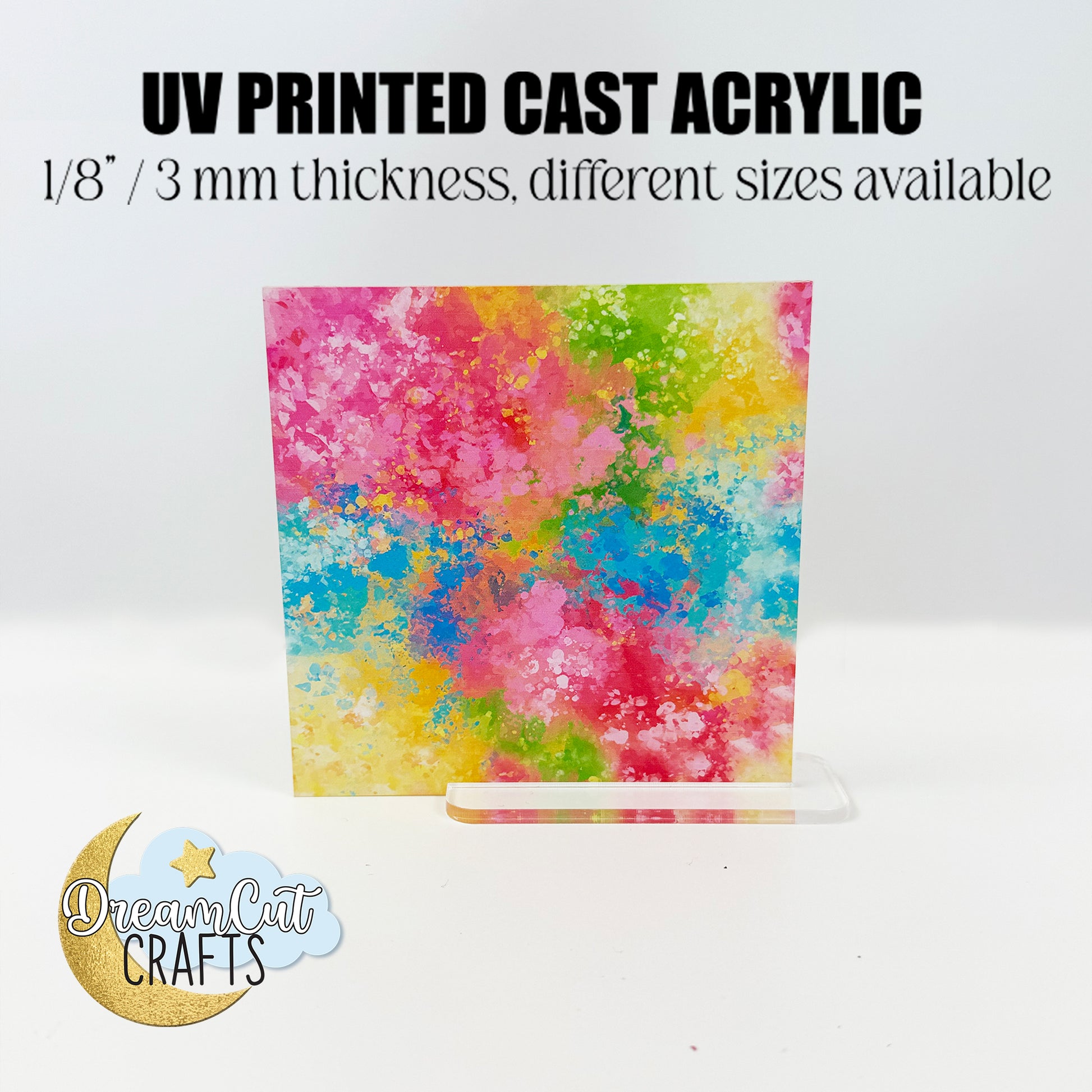 Add vibrant, playful energy to your laser projects with this Rainbow Splashes UV printed acrylic sheet. The design features colorful abstract bursts in bright pink, yellow, turquoise, green and blue, creating a cheerful artistic pattern perfect for makers who love bold, expressive designs. This sheet brings a lively finish to jewelry, charms, keychains, bookmarks, ornaments, tags, décor pieces and unique handmade accessories.